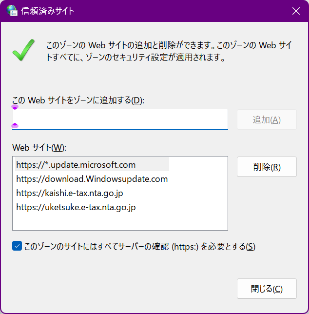 また、別窓が開くので「このWebサイトをゾーンに追加するの所に下記のURLを打ち込んで「追加」ボタンをクリックすればマイクロソフトのアップデートで利用するサイトを追加できます。