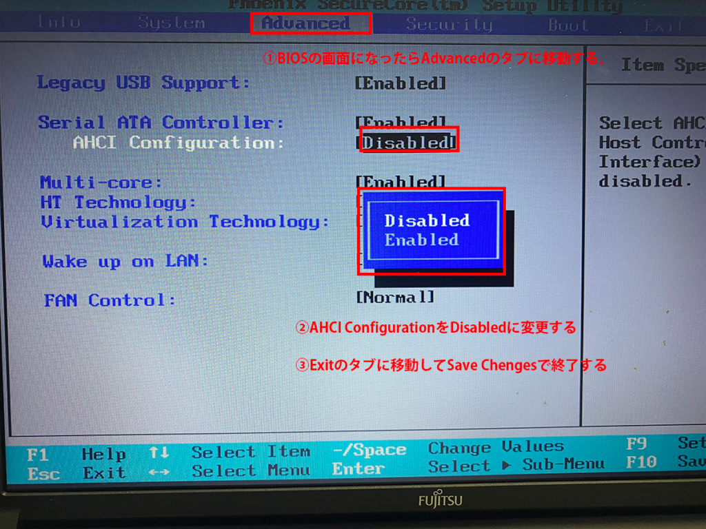 - Advancedの画面にAHCI ConfigurationがEnableになっているのでDisabledに変更します。