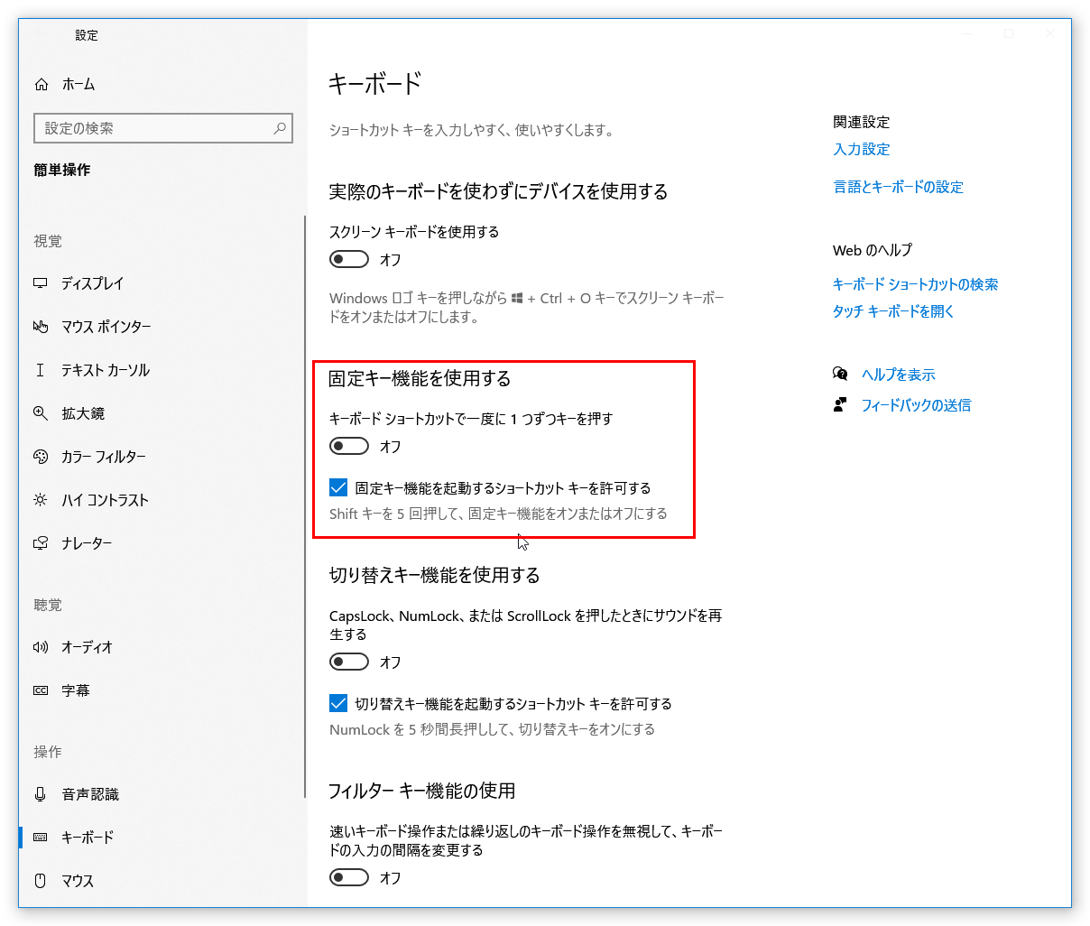 - 「固定キー機能を使用する」という項目があるため、そちらで設定変更可能です。