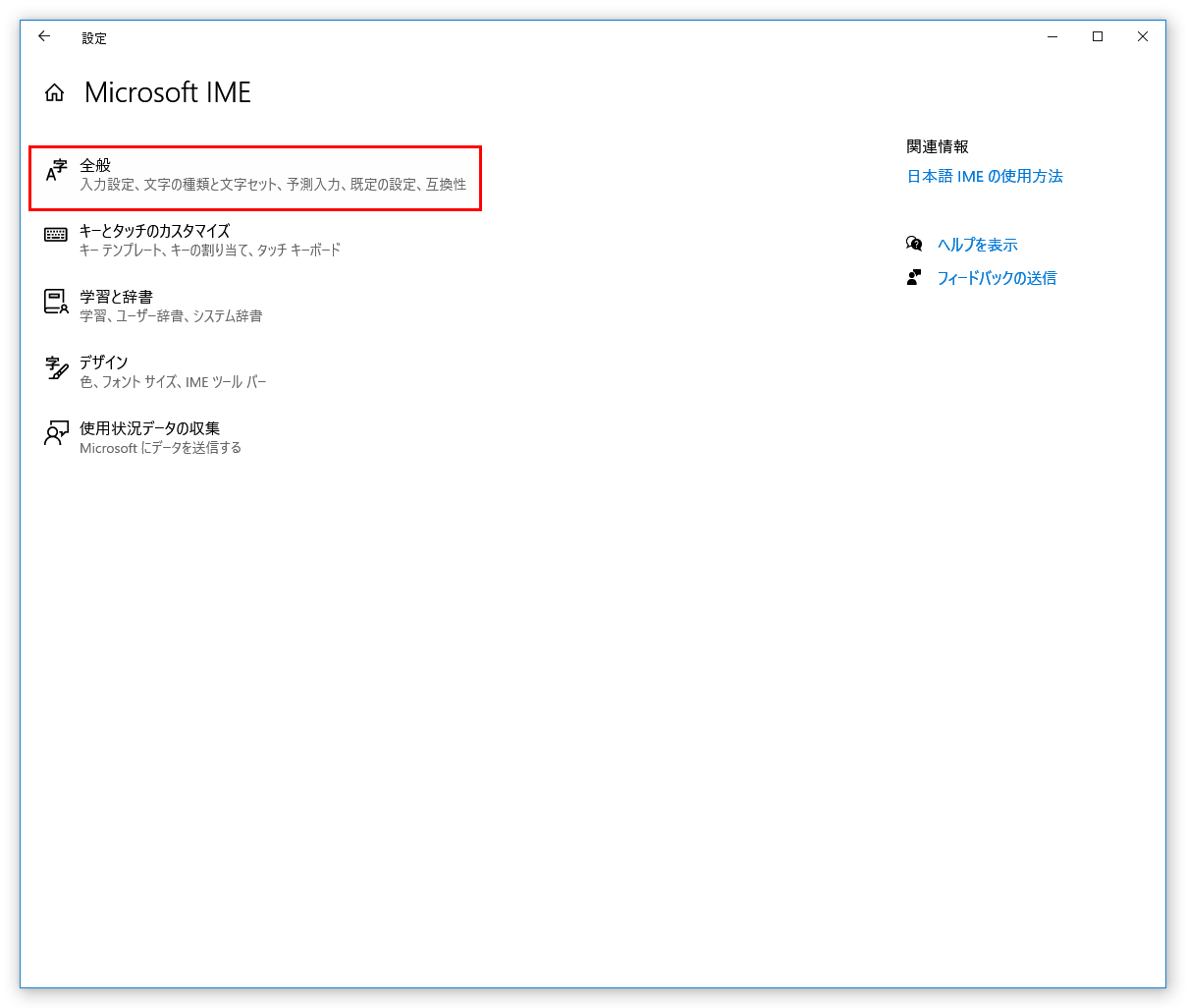 - 「Microsoft IMEの設定」が表示されるので、下部の「全般」をクリックします。