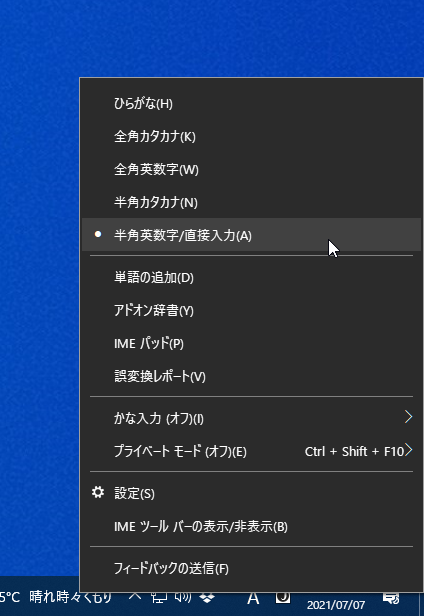「A」であれば英数字入力、「あ」と表示されていれば日本語入力モードです。